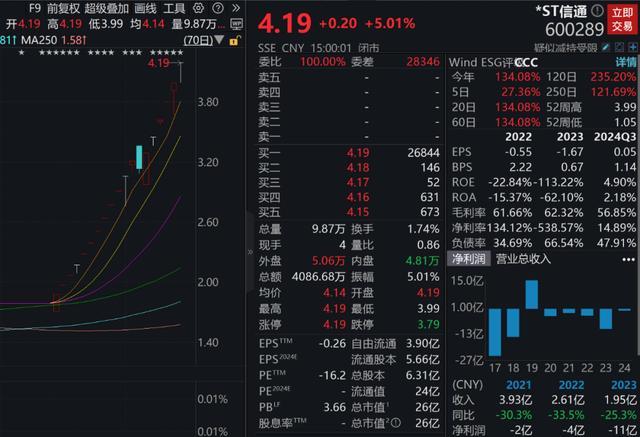 公开信息显示,*ST信通股价自1月14日复牌以来连续涨停,至今已19天18板个涨停,累计涨幅高达134.08%。但在飙升的股价背后,确实连年亏损的业绩表现。公司预计2024年度实现归母净利润亏损1.13亿元到亏损7600万元,2023年归母净利润为亏损10.51亿元。截至去年9月30日,公司股东户数为2.06万户。